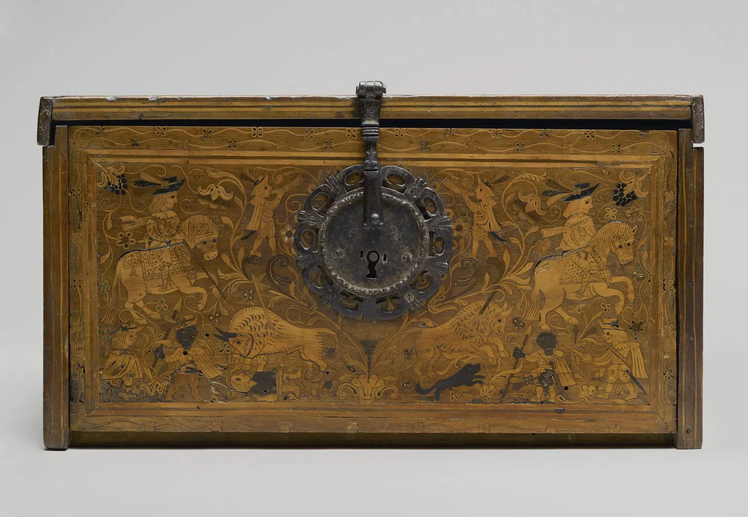 - Marquetry traveling desk with fall-front and scene of Adam and Eve on the interior of the lid.